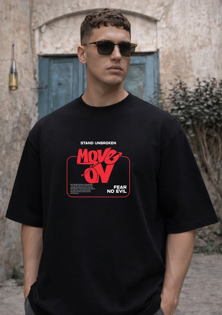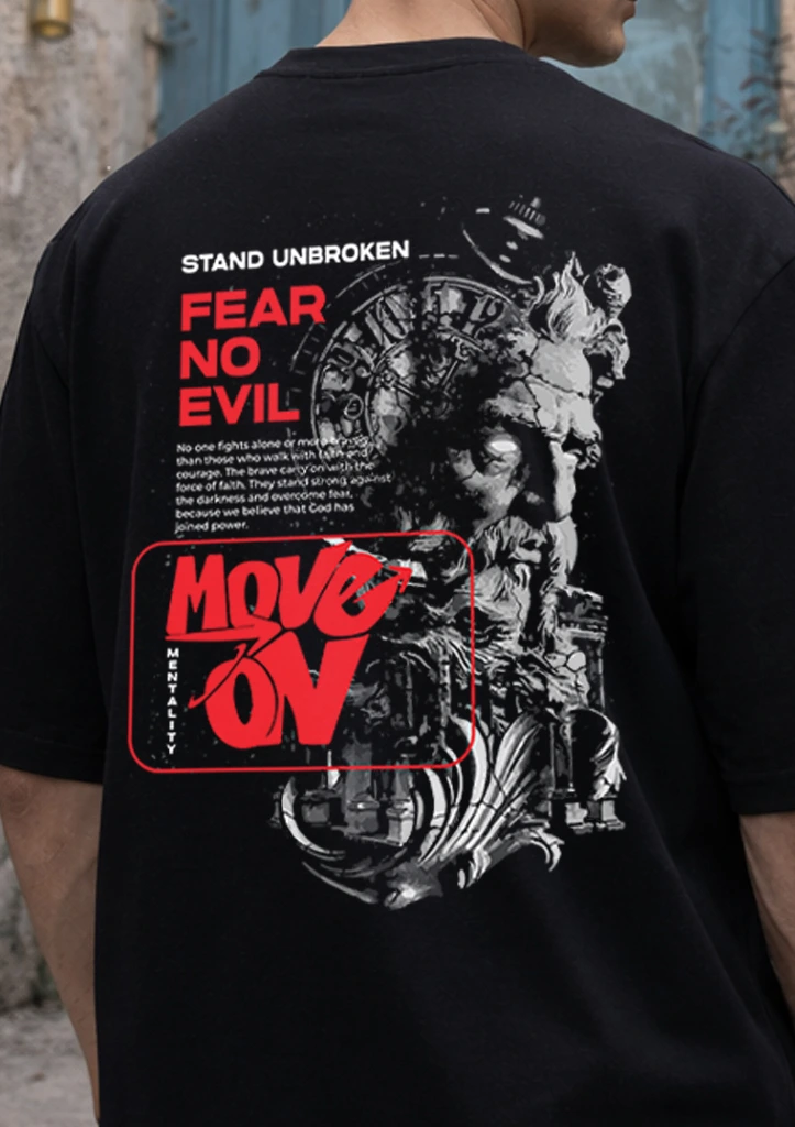 A bold Move On Mentality graphic T-shirt with a powerful Fear No Evil design, symbolizing strength and resilience. Made from premium cotton for a comfortable everyday streetwear look. ๐ฅ๐