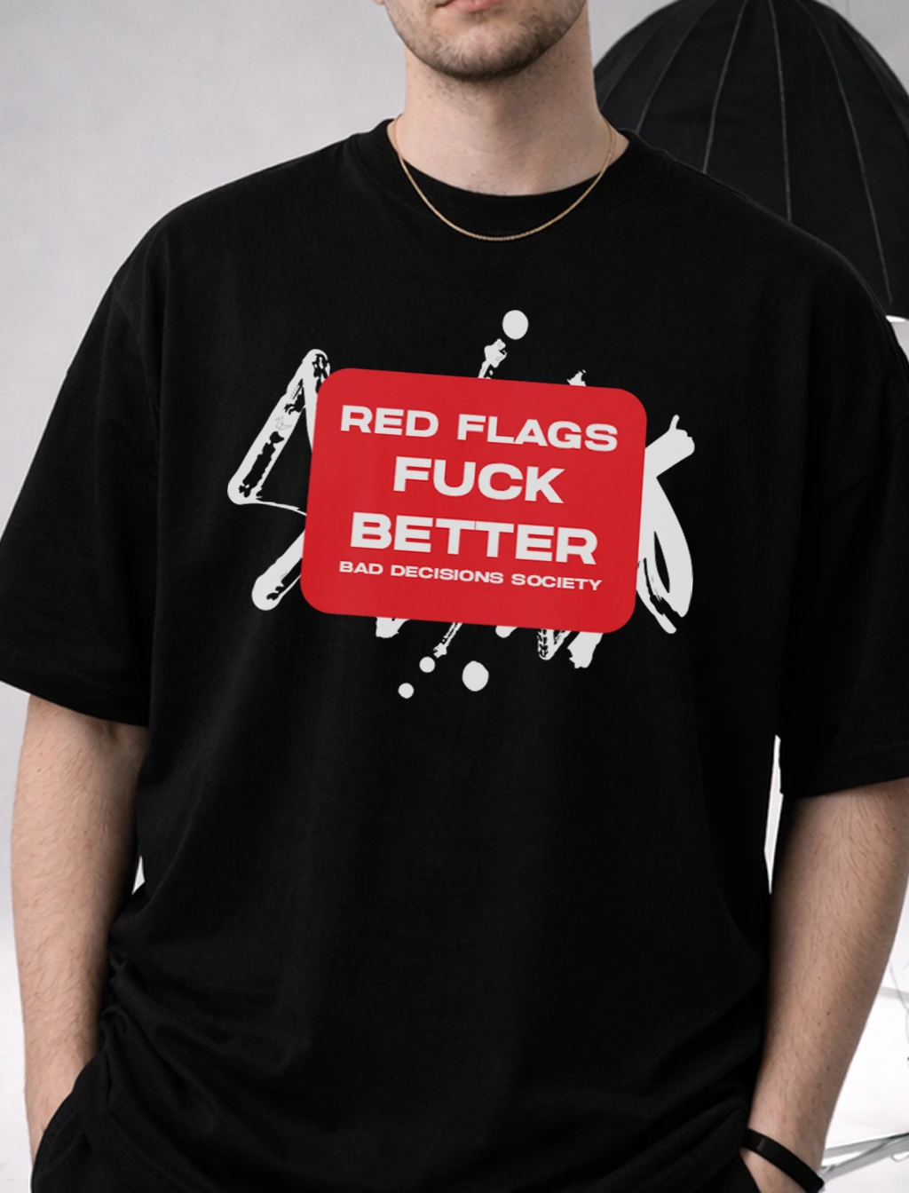 Bold, edgy, and made for statement-makers. This oversized black graphic T-shirt features a striking “Red Flags Fuck Better – Bad Decisions Society” design that blends humor with streetwear attitude.